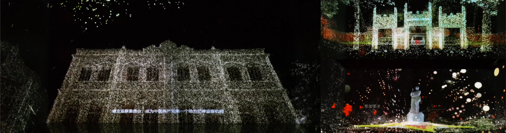 该作品通过空间计算与集群智能算法,将点云艺术与印象派艺术的表现手法进行融合,以“星星之火”的意向重构建筑空间。农民运动讲习所、广州公社、全国劳动大会旧址、东园文化广场、中共广东区委旧址、海珠广场纪念雕塑等红色印迹的粒子在观者身边绽放,伴随着音乐舞动,将每个人紧紧地包裹在红色时空之中。